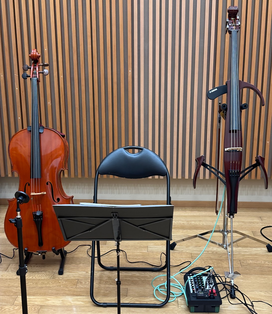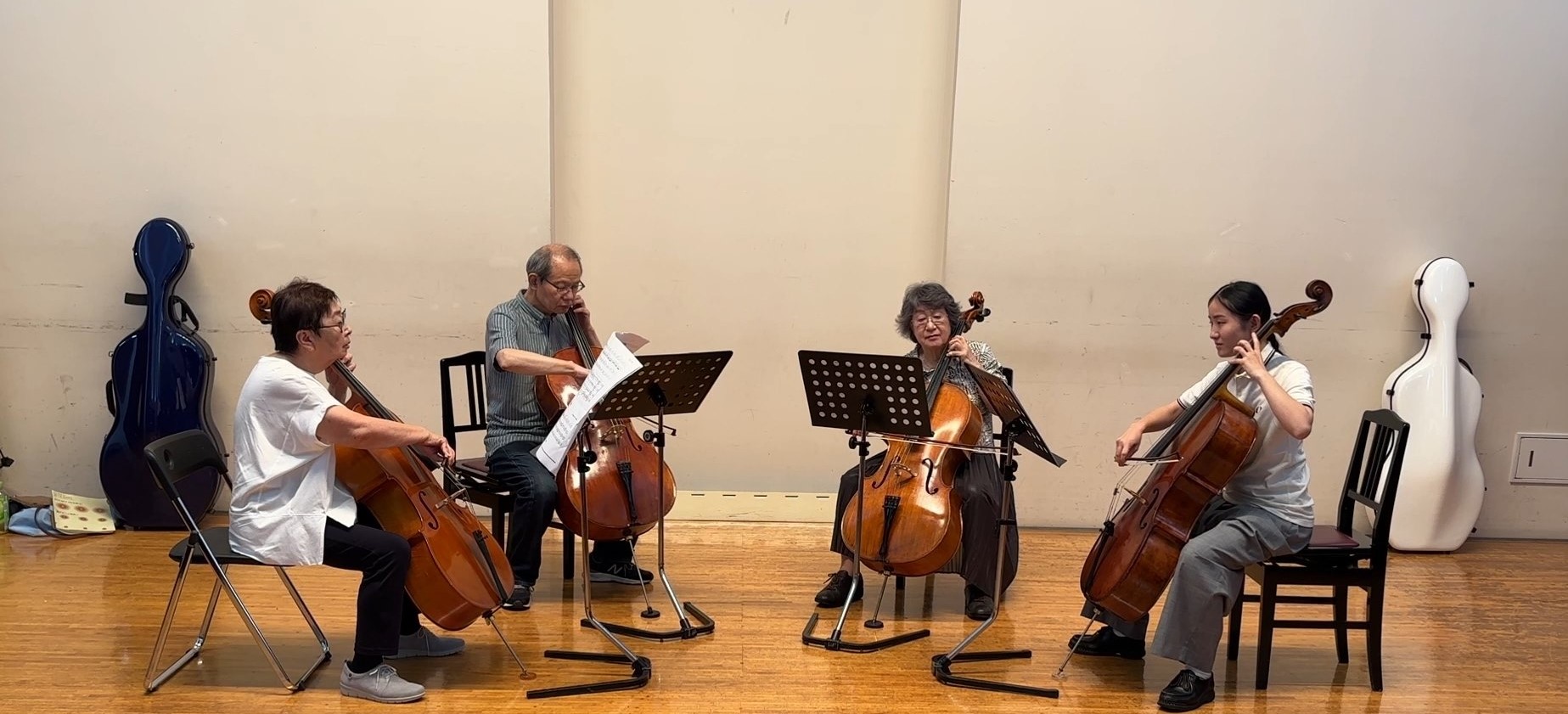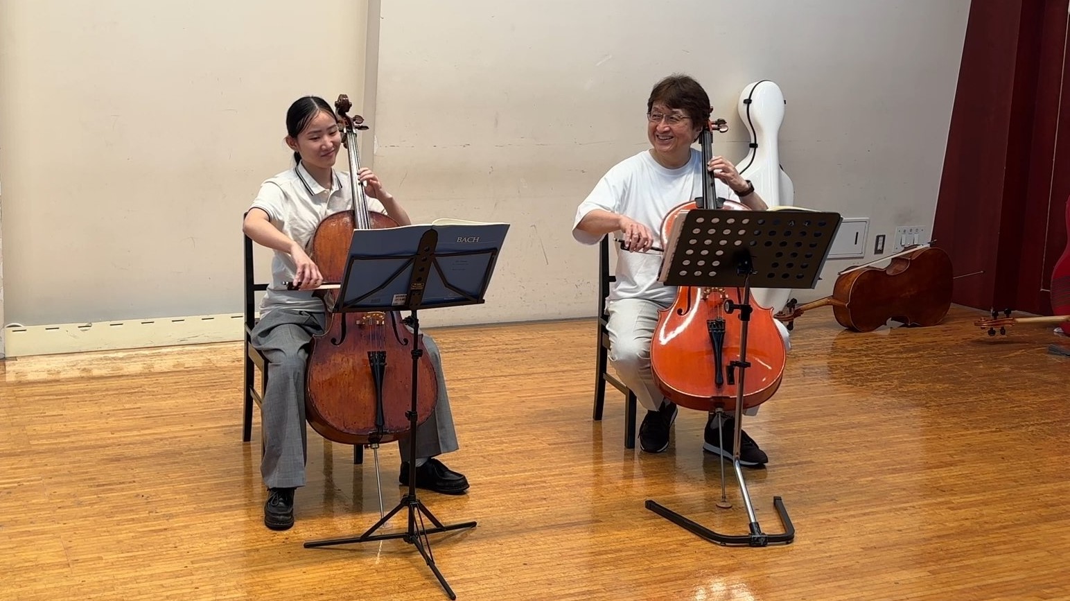 また当教室では年2回ほど音楽ホールでのレッスンも行っております。普段ご自宅やコミュニティセンター等、本来クラシック音楽を奏でる為の環境では無い響きでの練習やレッスンを行うのに対し、お持ちの楽器の響きに音楽ホールの持つ独特の響き、音色、残響、空間をプラスし、生徒さん皆さんがコンサートホールでのチェロの響きを堪能する事が出来る、音楽ホール(旭区民文化センターサンハート音楽ホール)での合同レッスン練習会を開催しております。